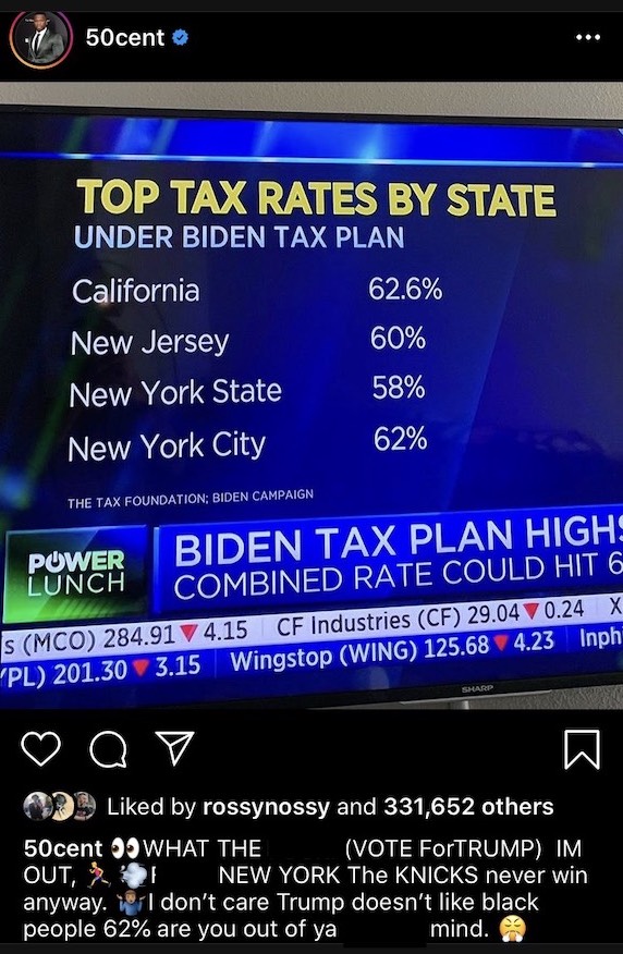 Curtis “50 Cent” Jackson also took umbrage with Joe Biden’s tax plan