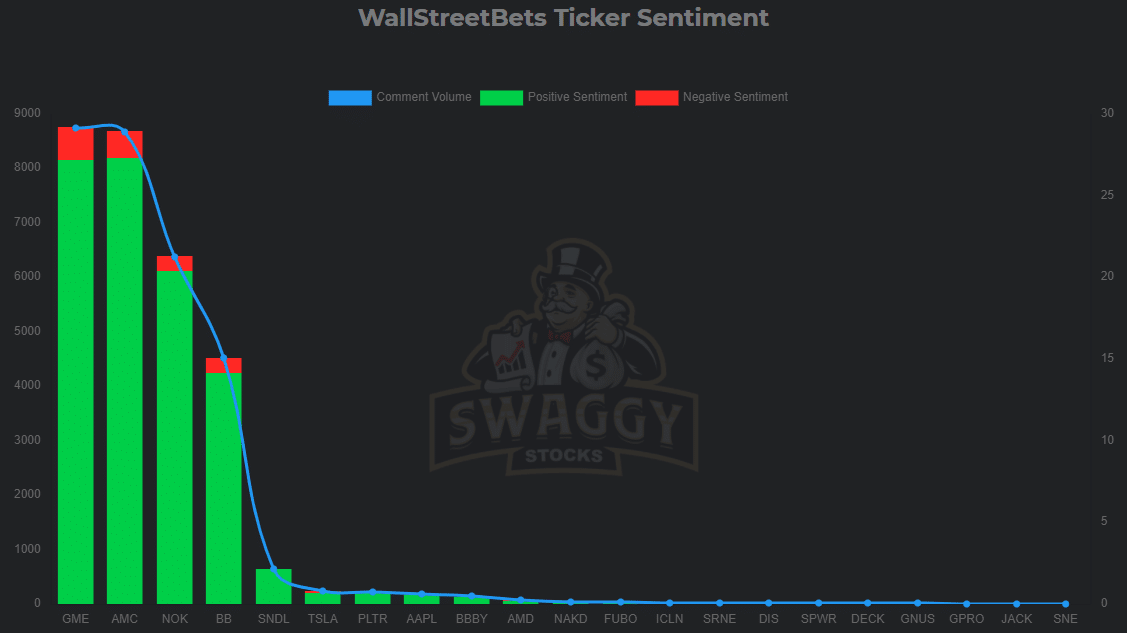 Data about posts and comments on Reddit’s Wallstreetbets, aggregated on swaggystocks.com, showed GameStop and AMC were by far the most discussed stocks on the discussion group that has fueled their recent surge, with both continuing to enjoy overwhelming positive sentiment.
