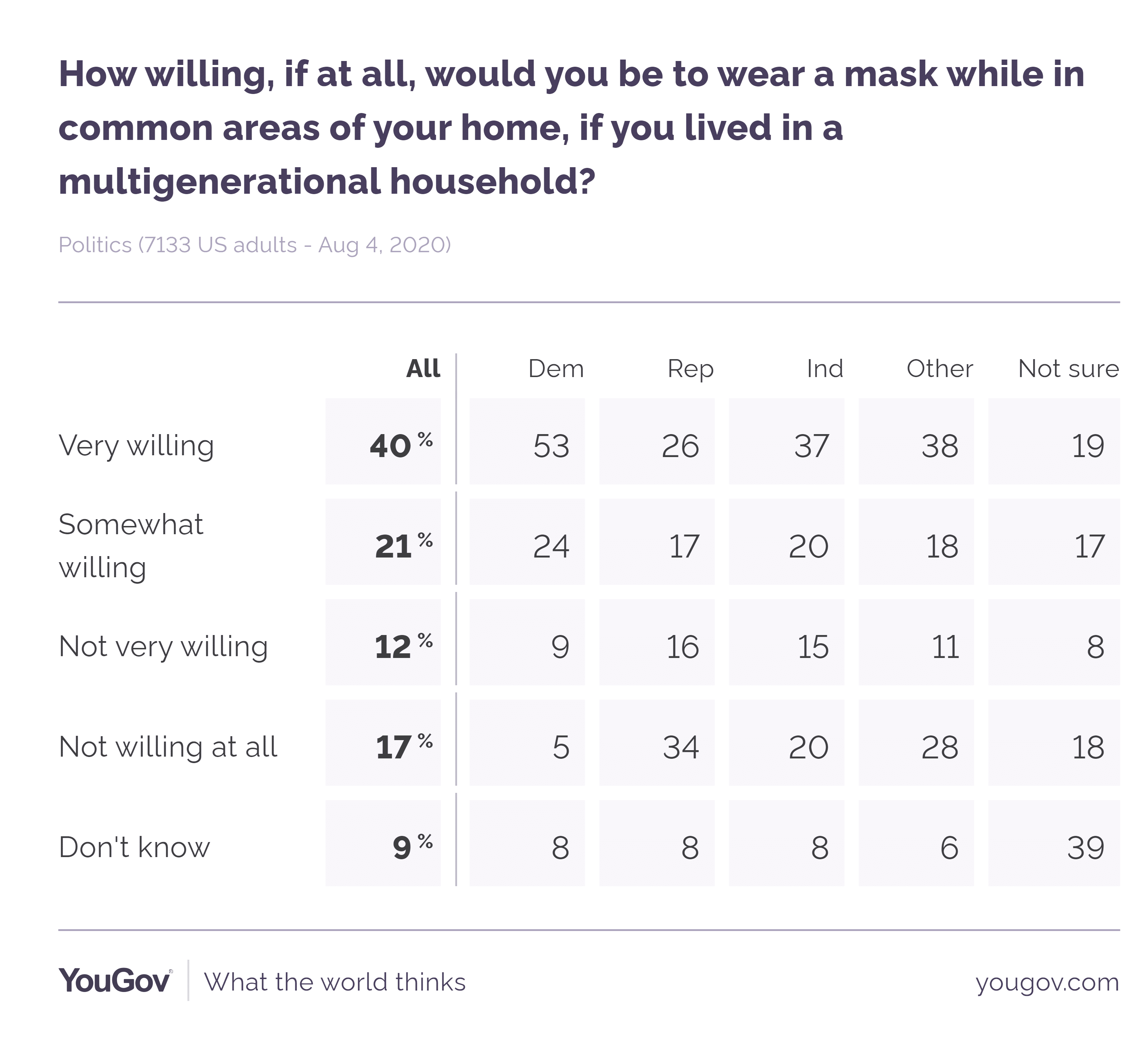 A YouGov survey conducted in August finds two in five (40%) Americans are very willing to wear a mask in the common areas of their home, if they lived in a multigenerational household. Over one in five Americans (21%) say they are somewhat willing to wear a mask while in the common areas of their home, compared to 17 percent who say they would not be willing at all, and 12 percent who are not very willing to do so.