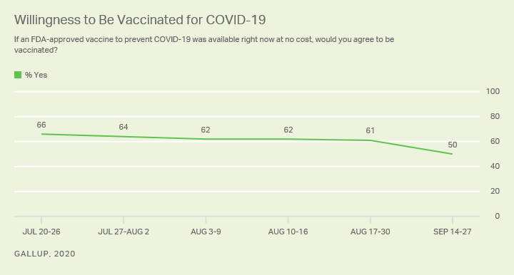 Americans’ willingness to be vaccinated against the coronavirus has dropped 11 percentage points, falling to 50% in late September. This sharp decline comes after the percentage dwindled from 66% in July to 61% in August.