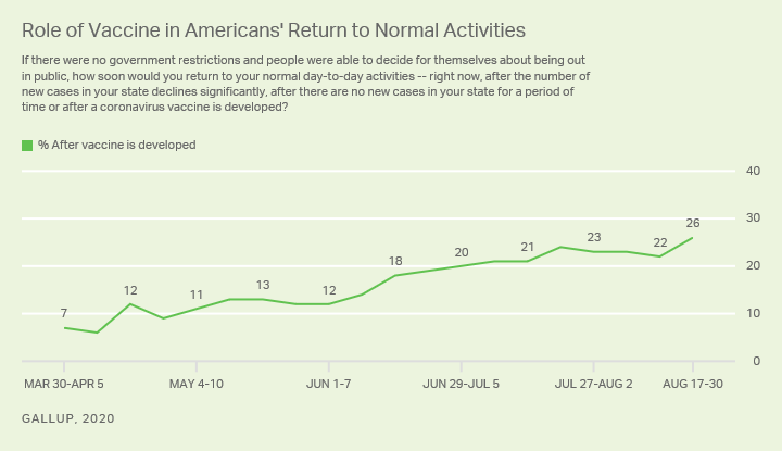 Meanwhile, according to Gallup Panel data from Aug. 17-30, the percentage of Americans who are inclined to delay returning to their normal daily activities until a vaccine is available is at a new high of 26%.