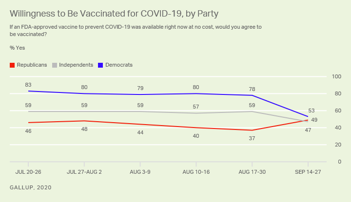 Democrats may be answering Gallup’s question about getting an FDA-approved vaccine “right now” in the context of Trump’s position, not as a hypothetical scenario. However, a recent CNN poll also found a decline in public willingness to get the vaccine, from 56% in August to 51% in early October, without mentioning a timeframe. That question reads, “If a vaccine to prevent coronavirus infection were widely available at a low cost, would you, personally, try to get that vaccine, or not?”