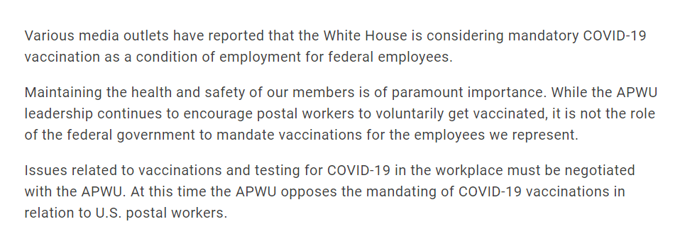 The influential American Postal Workers Union on Wednesday said that at this point, it opposes a coronavirus vaccine mandate from the Biden administration but encouraged workers to voluntarily take the jabs.
