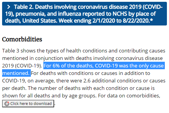 In the latest update, the CDC pointed out that only 6% of deaths related to COVID-19 listed COVID-19 as the only cause of death. The vast majority of patients that were listed as COVID-19 related deaths also suffered from serious comorbidities.