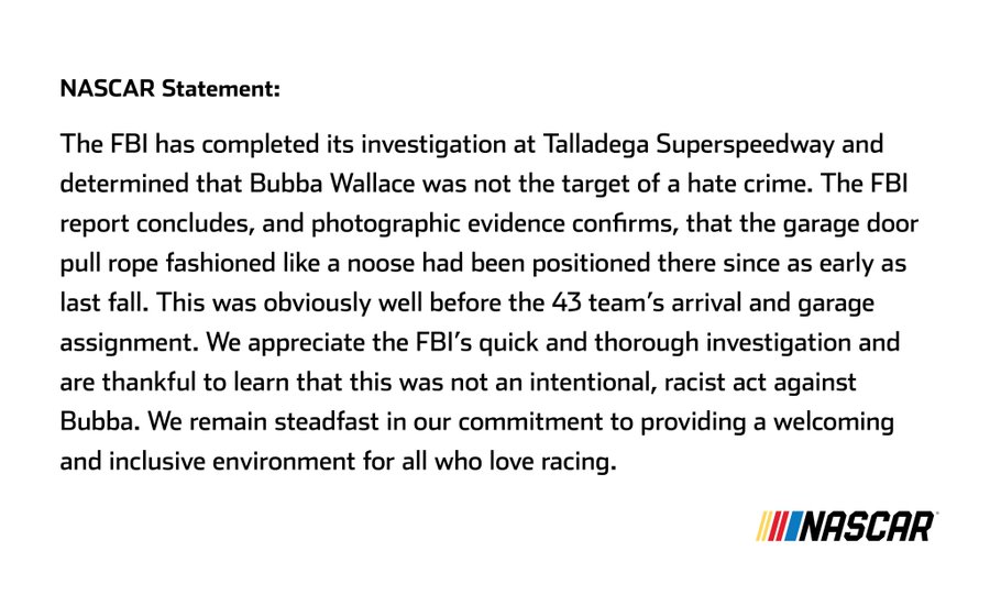 “The decision not to pursue federal charges is proper after reviewing all available facts and all applicable federal laws. We offer our thanks to NASCAR, Mr. Wallace, and everyone who cooperated with this investigation,” the joint statement concluded.