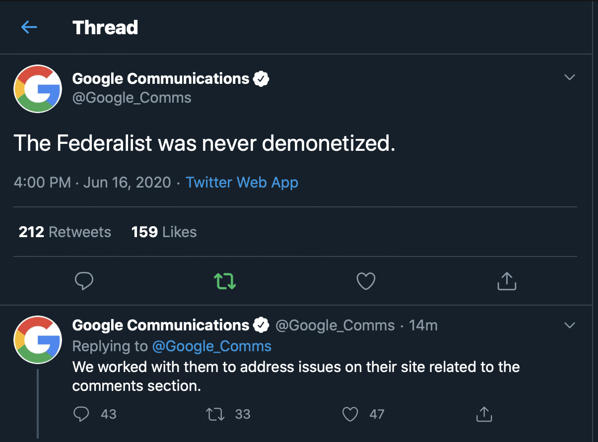 The two sites, ZeroHedge and The Federalist, will no longer be able to generate revenue from any advertisements served by Google Ads.