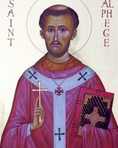 Winchester, VA – Born in 954, Alphege was destined first for the monastic life at Deerhurst monastery in Gloucester, England, and then for the hermitage near Somerset. While in Somerset, some men attached themselves to him, and would join him as monks when he and Saint Dunstan founded an abbey in Bath in the year 984. Alphege was abbot here, until he was appointed Bishop of Winchester later that year. He led an austere life during his two decades as bishop, and was instrumental in the conversion of the Danish chieftain to Christianity. In 1005, he became the archbishop of Canterbury and received the pallium from Pope John XVIII in Rome. Upon his return, he was captured by the invading Danes, and his ransom went unpaid. As a result, he was struck with an ax and killed. Saint Alphege, pray for us!
