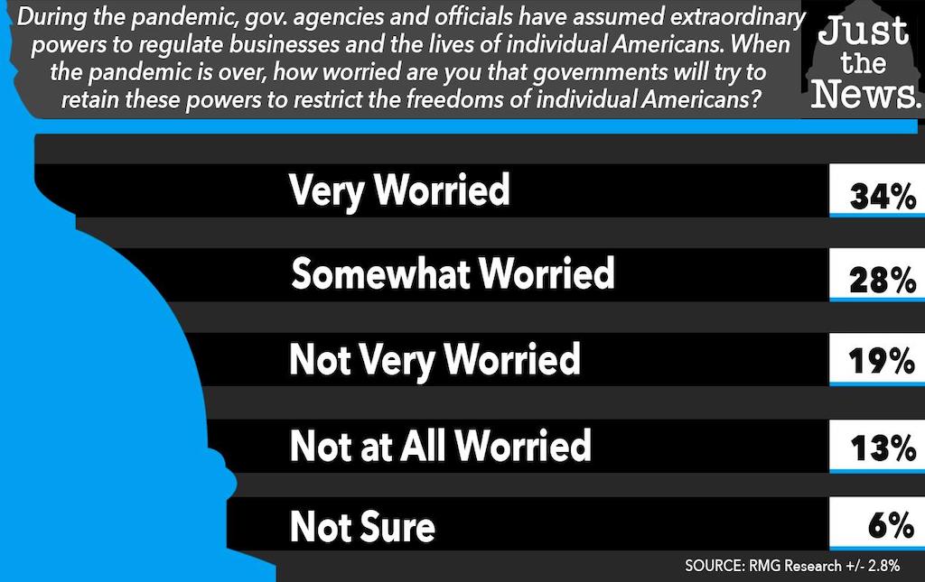 Sixty-two percent of the respondents said they were somewhat or very worried about American governments holding onto their pandemic powers after the health crisis finally subsides. Just 32% were unconcerned with that prospect.
