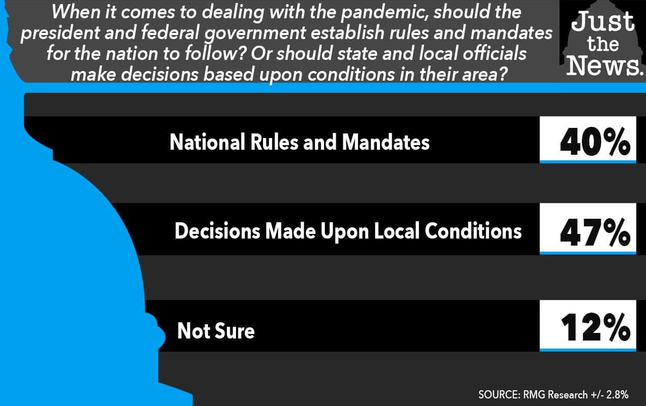 Nearly half of all registered U.S. voters want COVID-19 pandemic decisions made by local leaders as opposed to national ones, according to a new Just the News Daily Poll with Scott Rasmussen.